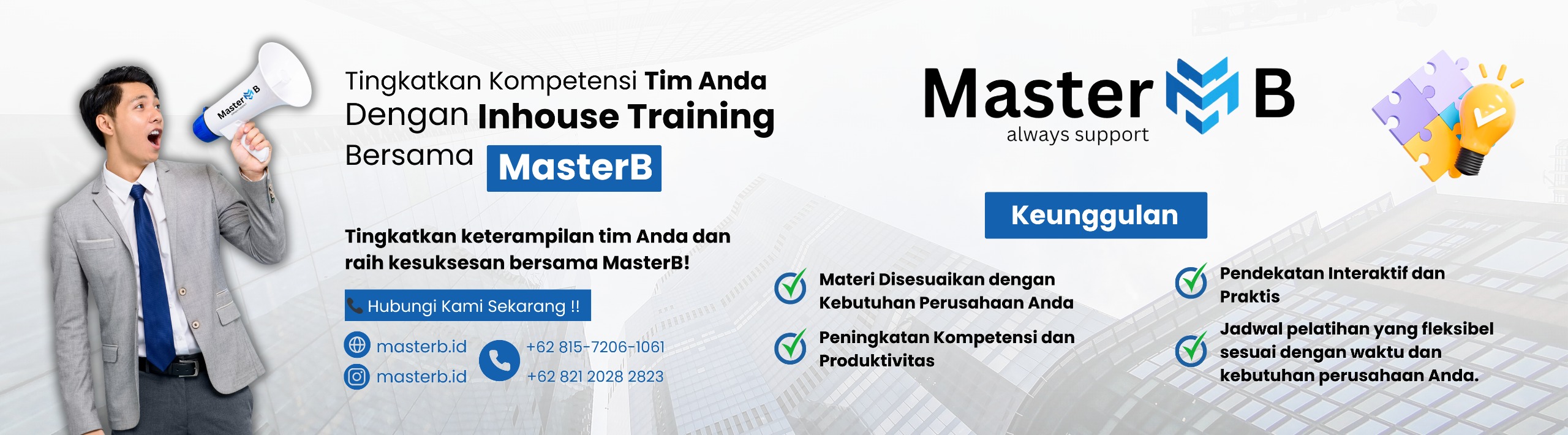 MasterB kini hadir dengan layanan baru: Trainer by MasterB yang siap memenuhi kebutuhan perusahaan Anda akan trainer profesional dan berpengalaman di berbagai bidang. Dapatkan pelatihan yang tepat sasaran, praktis, dan berdampak langsung bagi pengembangan karyawan Anda.